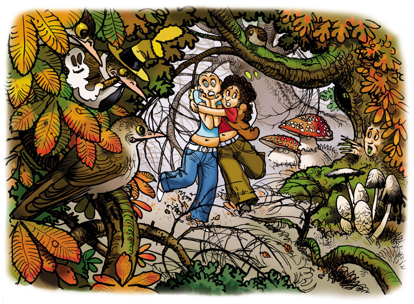 Illustratie bij kort verhaal “Ans en Greet en de geheime deur”, van Stefan Nieuwenhuizen in stripblad Parcifal
